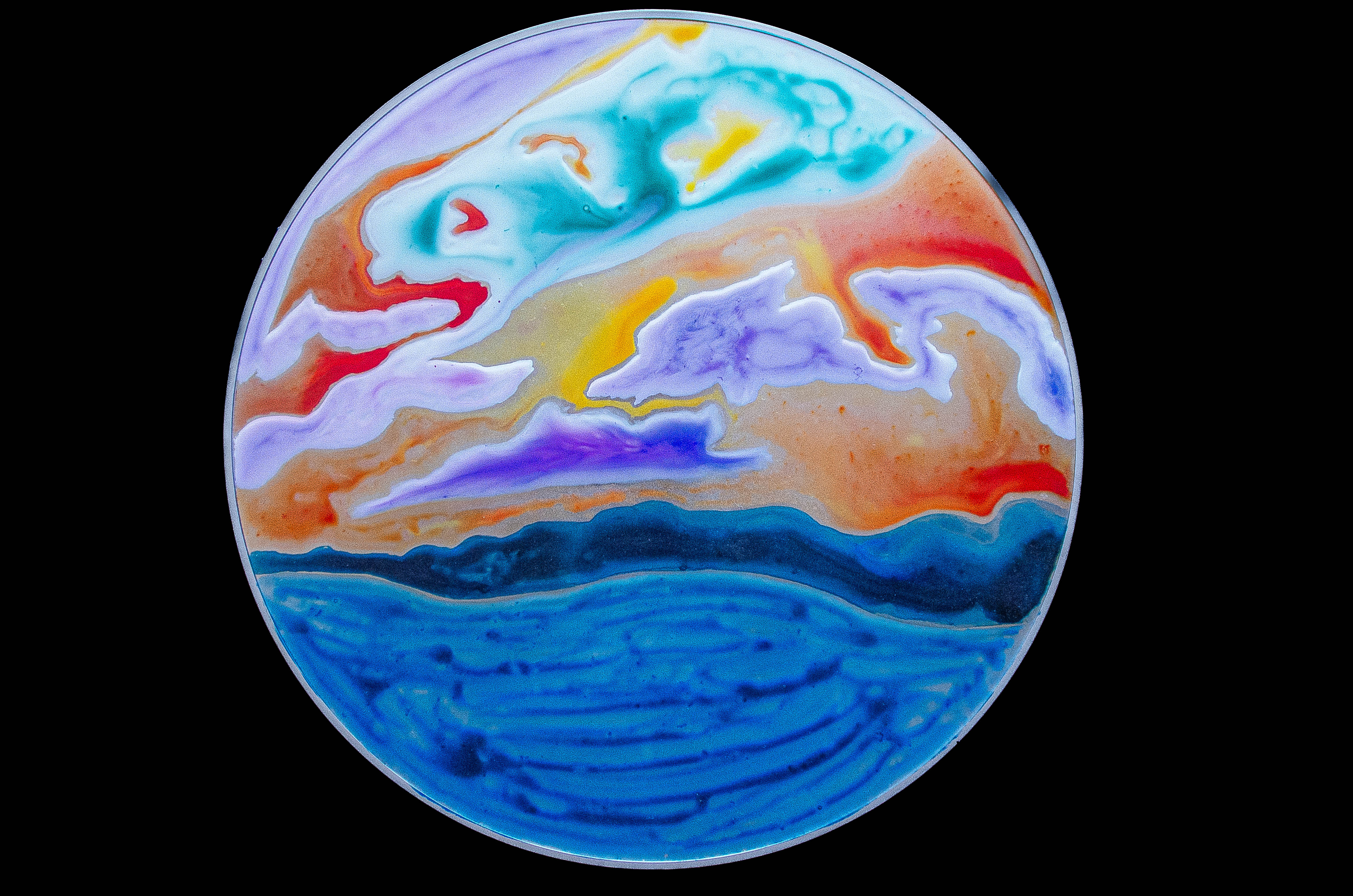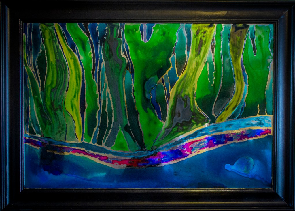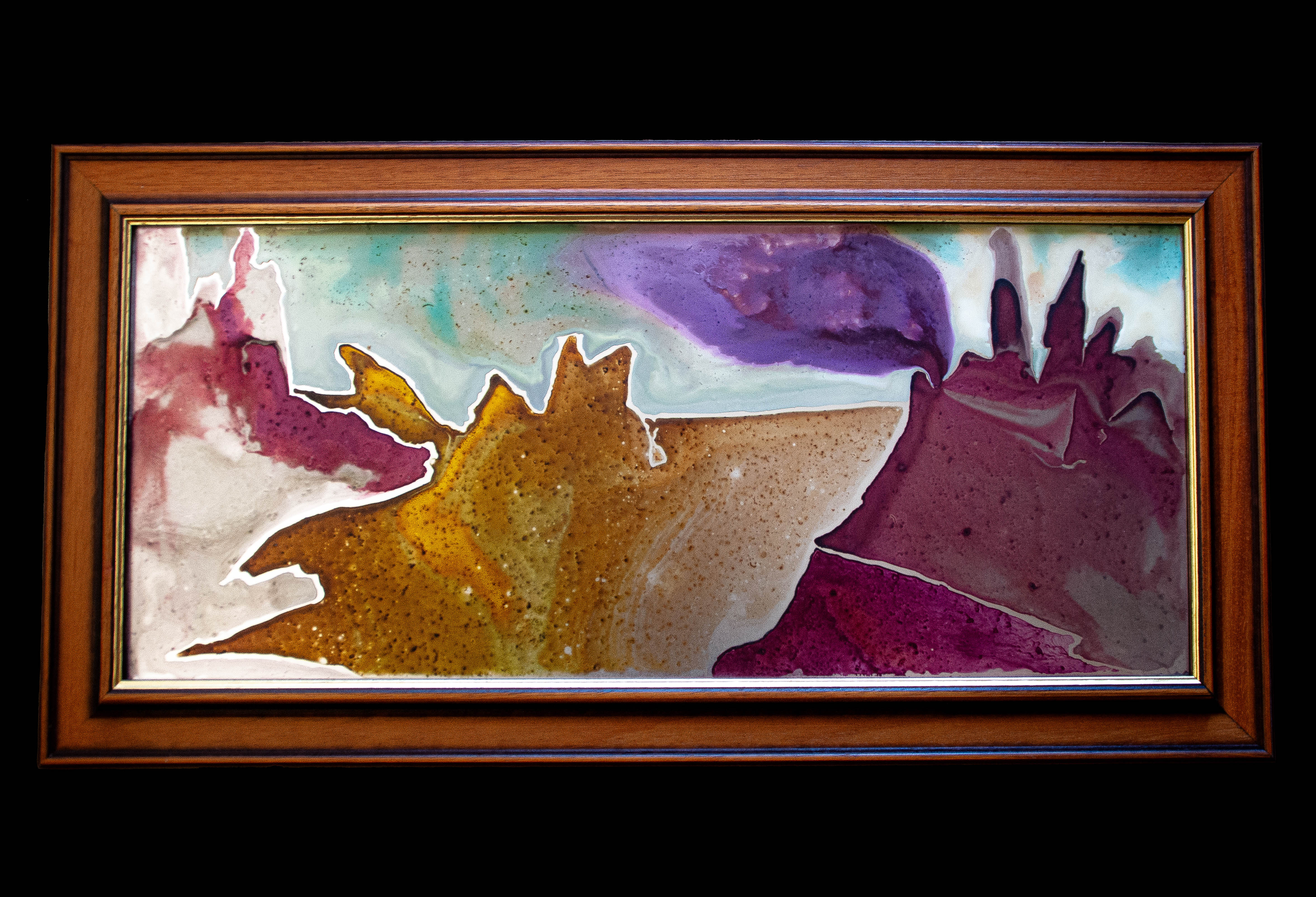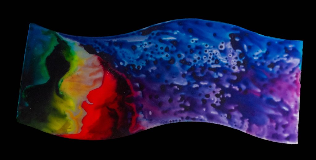 La pratique de l’encre sur verre repose sur un processus où l’évaporation lente d’une réserve devient le terrain d’une tension perpétuelle entre contrôle et chaos. Dans cette dynamique, le verre lui aussi prend toujours le dessus, échappant à la pleine maîtrise de l’artiste. C’est précisément cette incapacité à dominer totalement le medium qui le rend fascinant et qui pousse l’artiste à s’engager dans ce jeu constant avec l’imprévisible, où chaque geste devient une exploration des limites de la maîtrise et de sa liberté