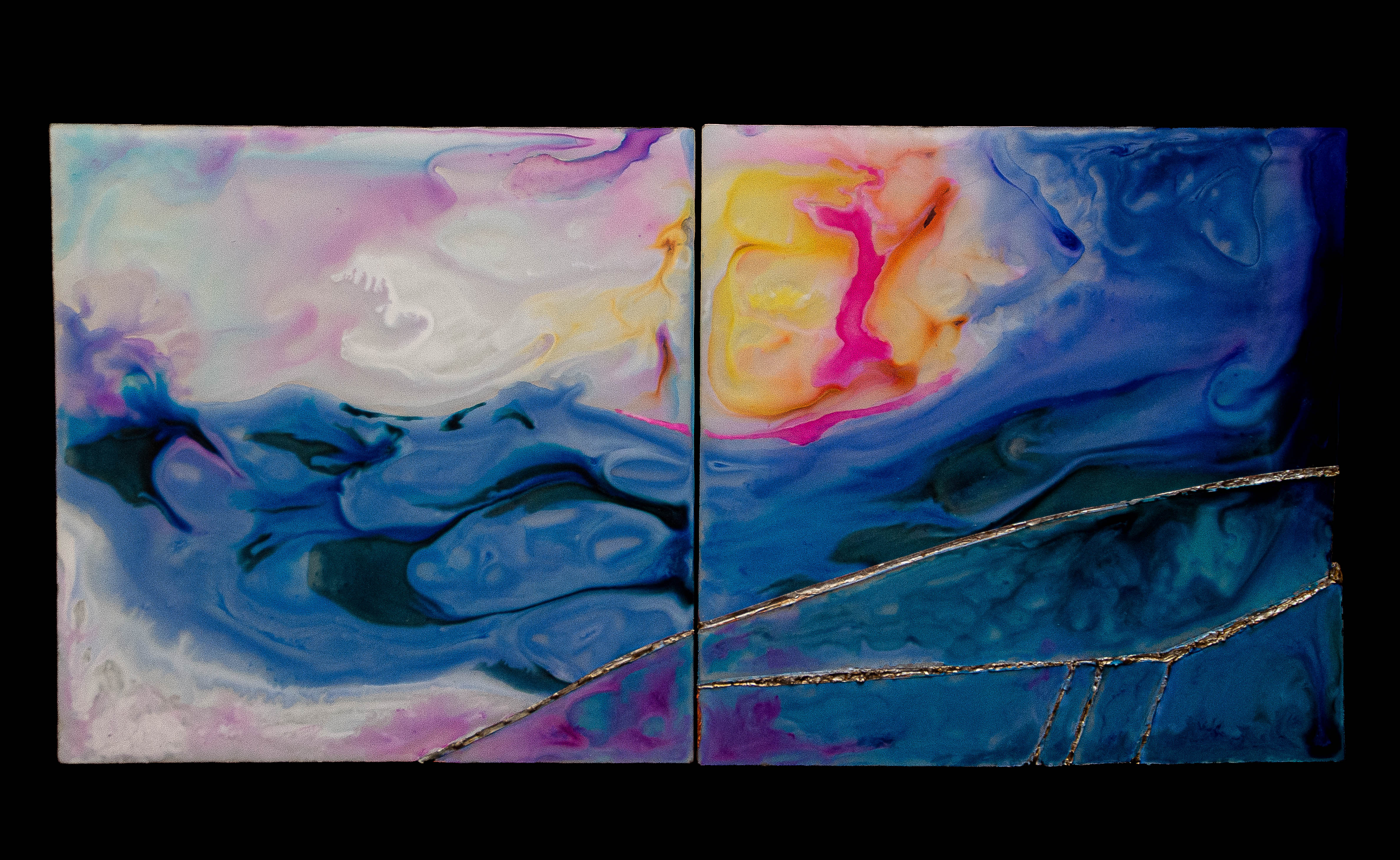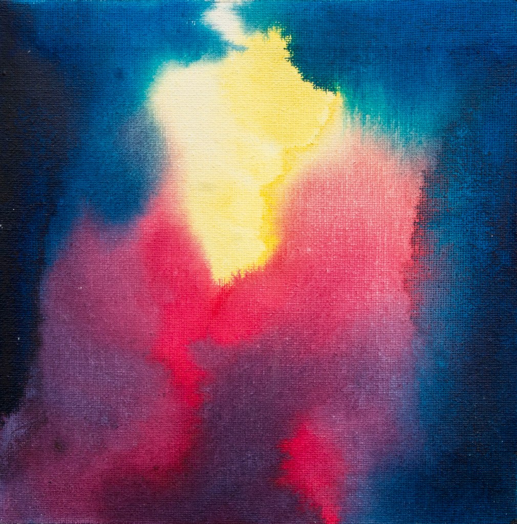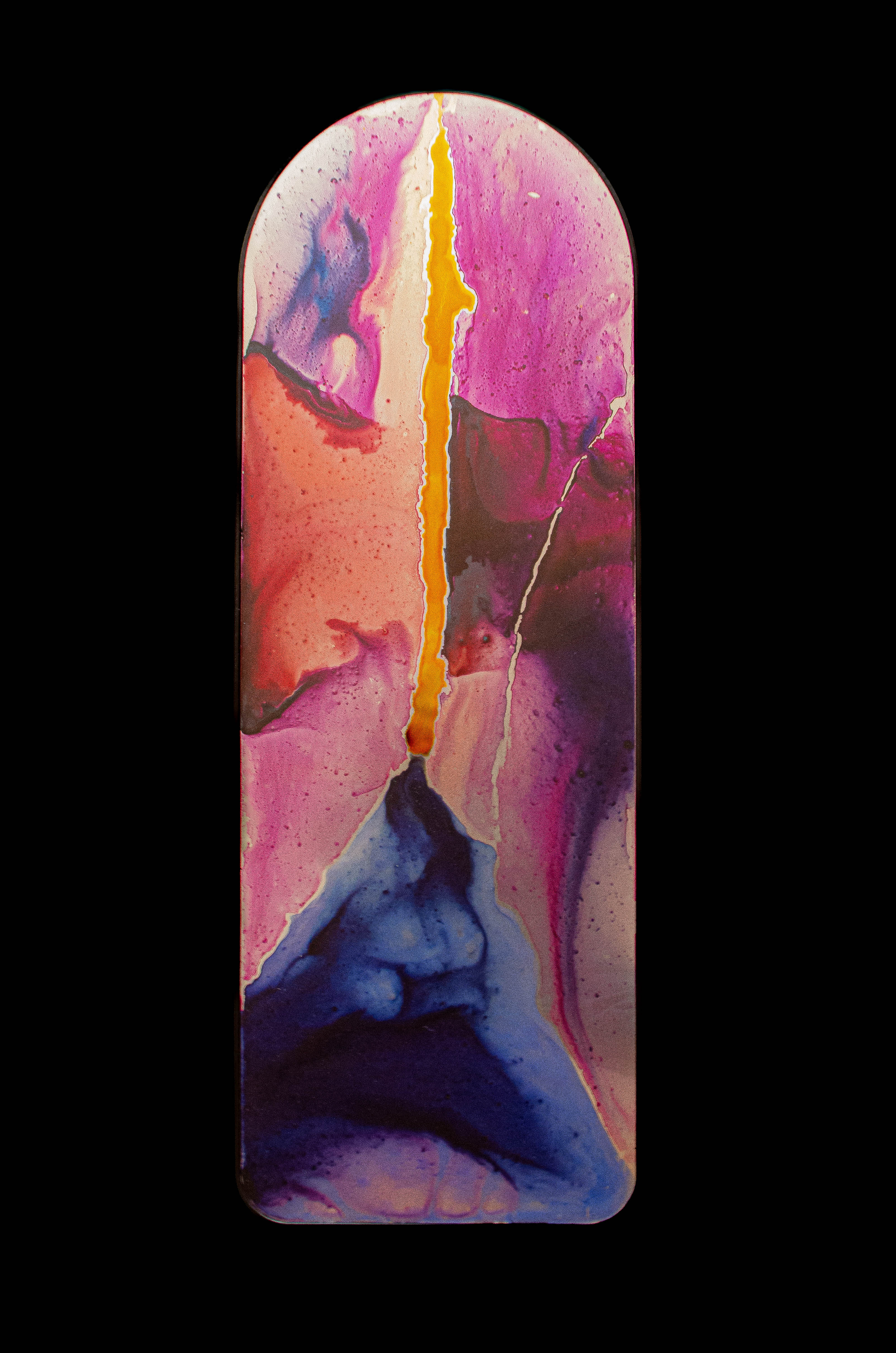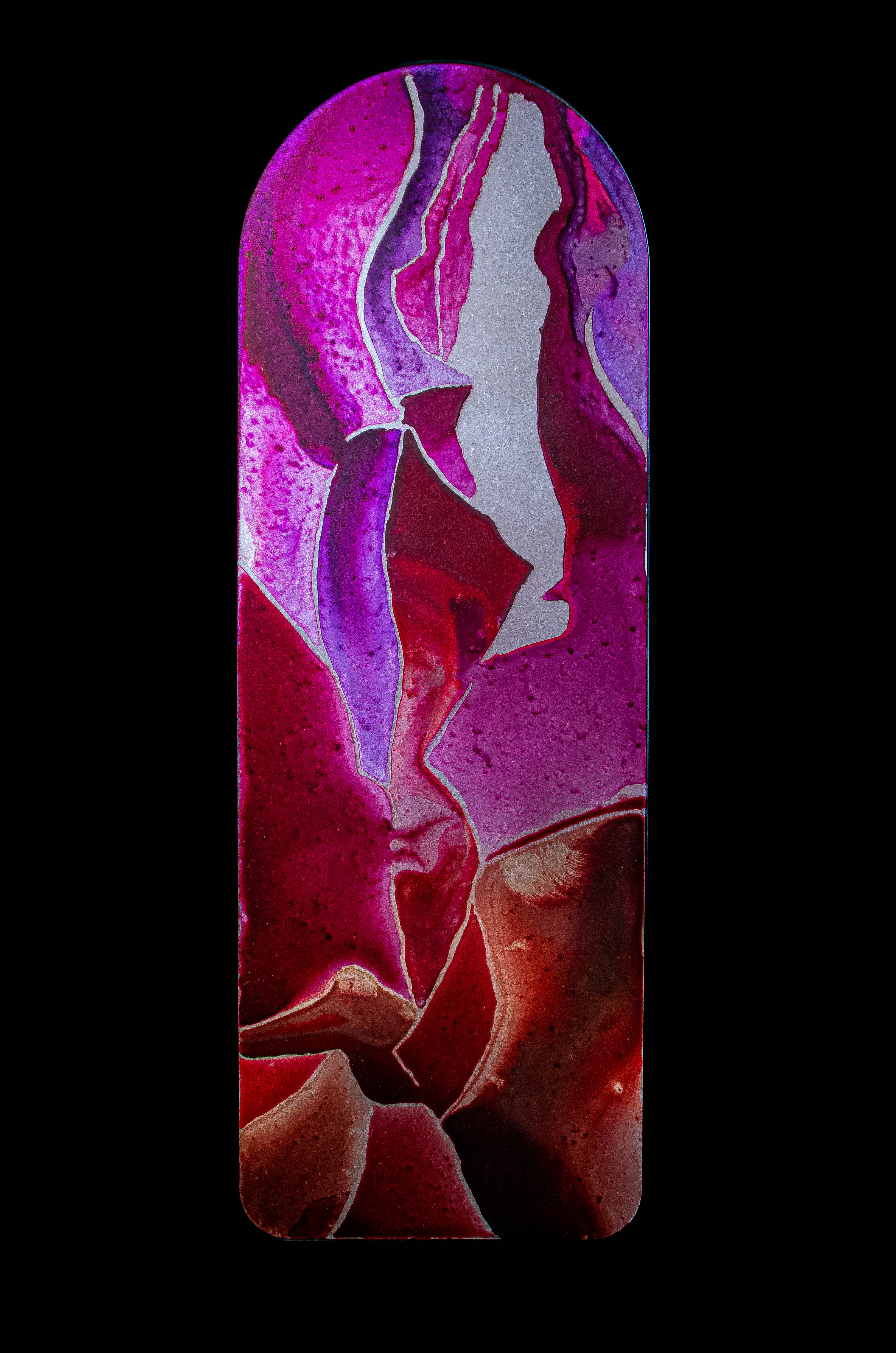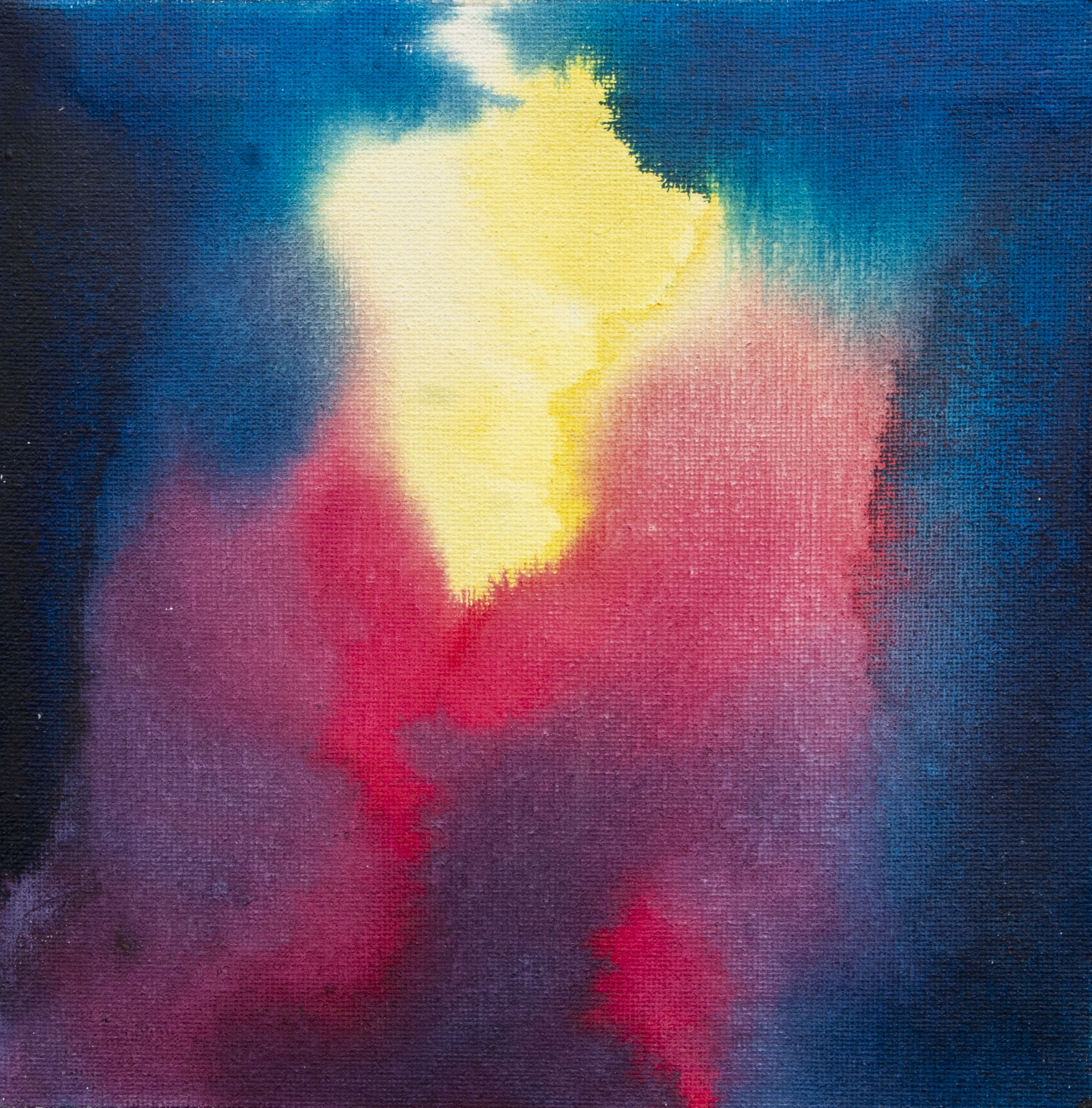 La suite de cette recherche nous emmène jusqu’à la peinture. Il propose aujourd’hui une série d’œuvres réalisées sur miroir, en utilisant de l’encre acrylique et de l’aquarelle. Son travail explore les interactions complexes entre la lumière, la transparence des encres colorées et les reflets du support. À travers cette technique, il cherche à atteindre l’inframince entre l’abstrait et le figuratif, créant des compositions énigmatiques qui évoluent en fonction du regard du spectateur.