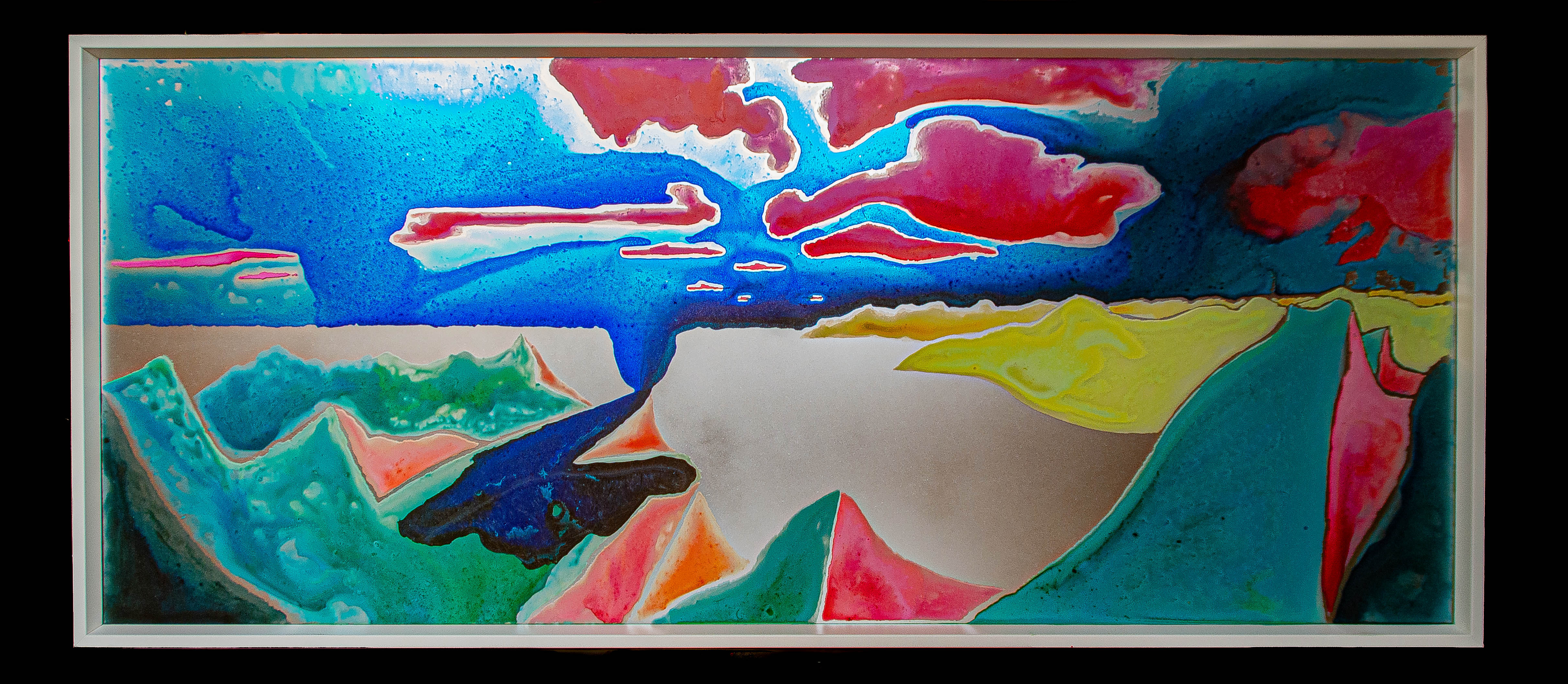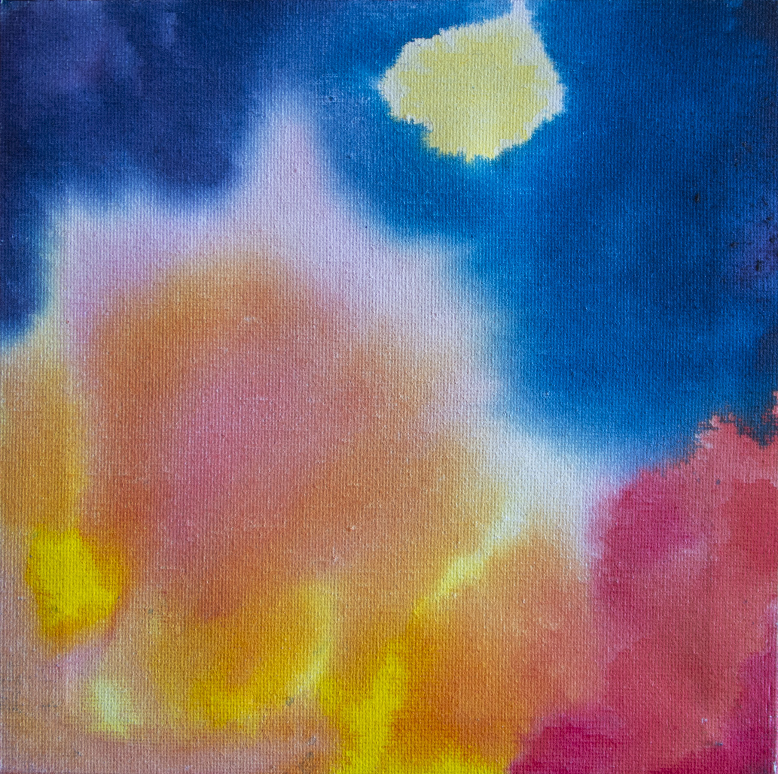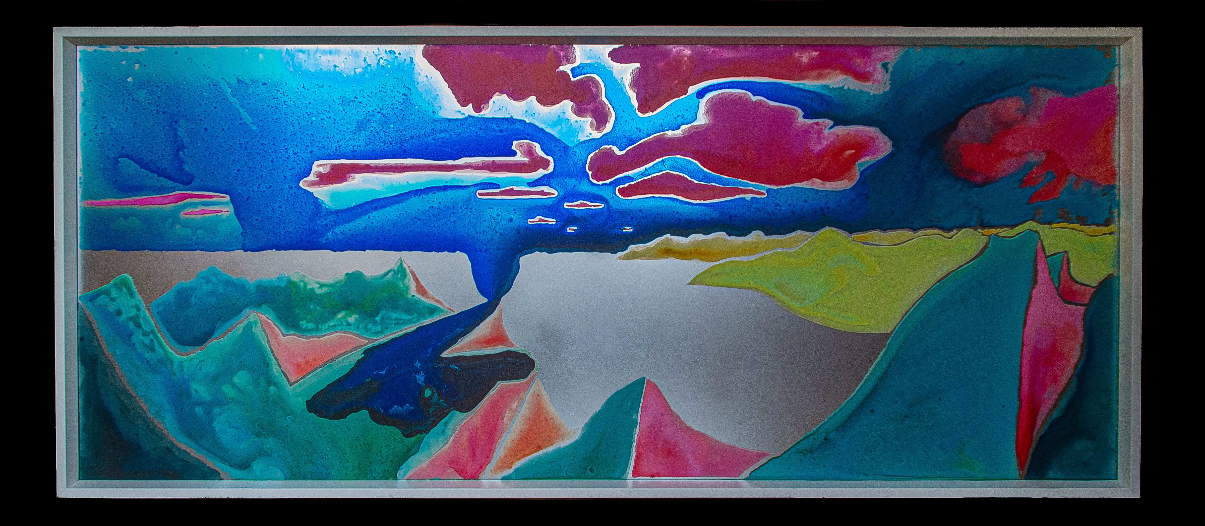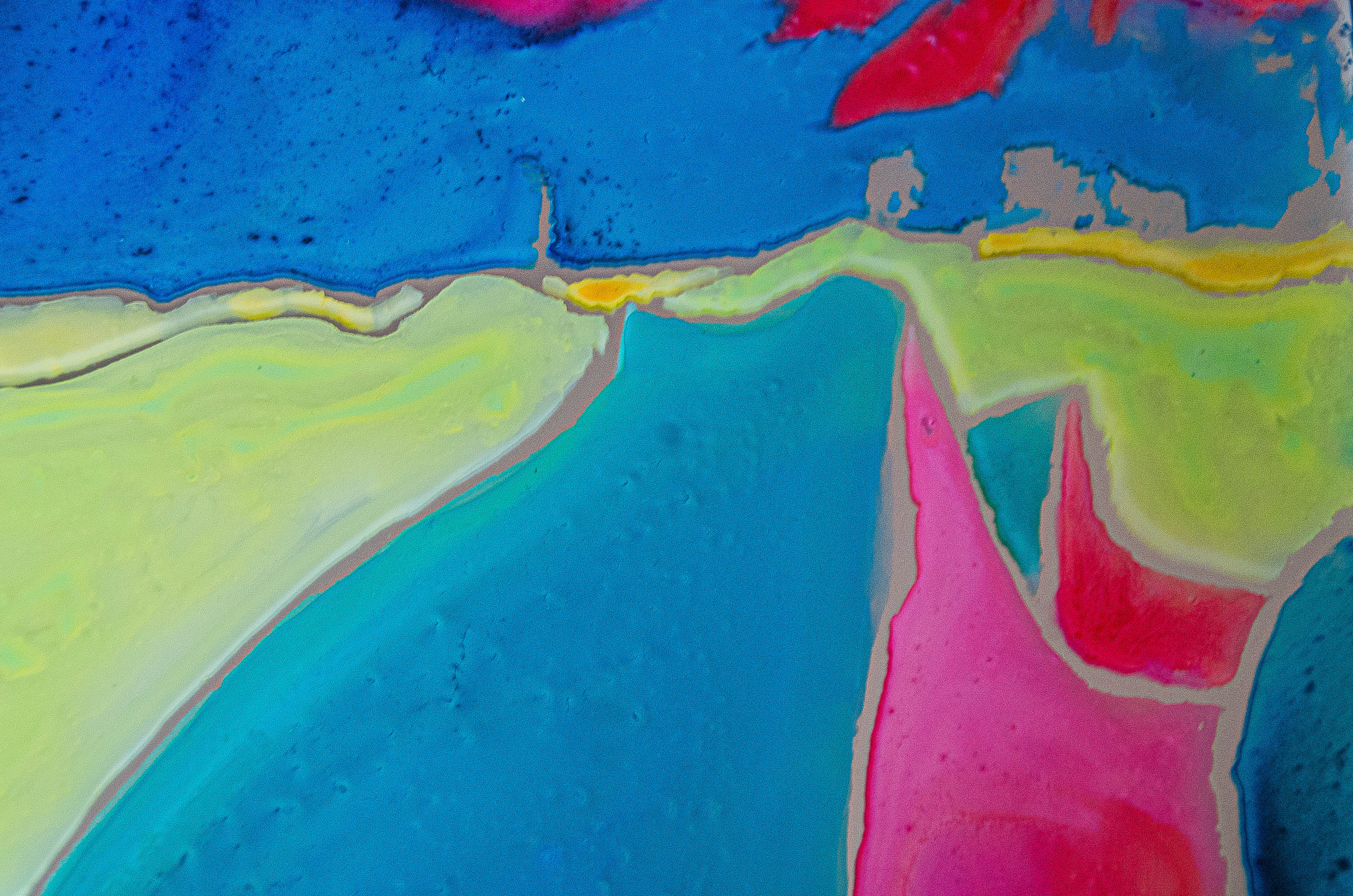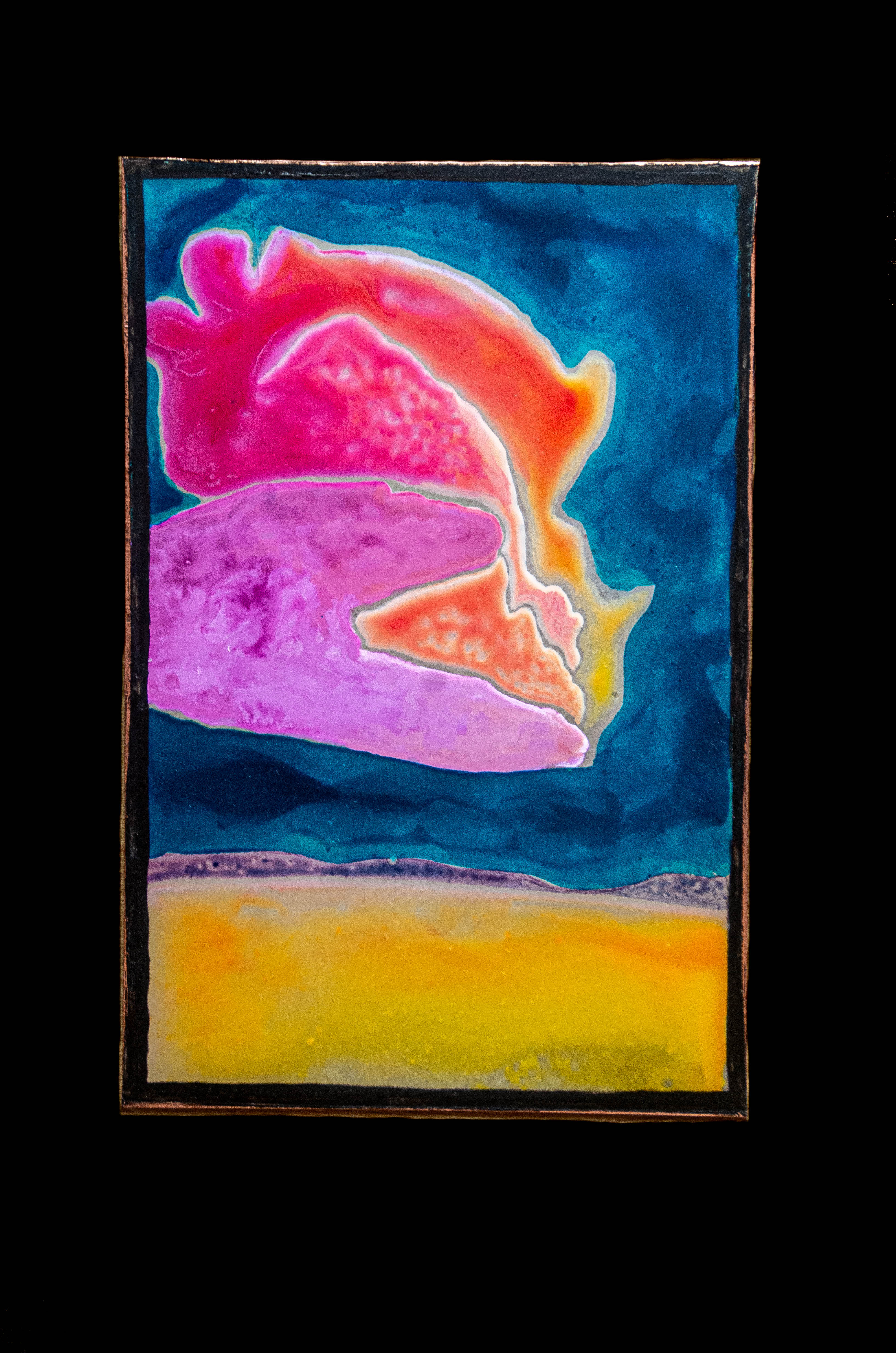 La suite de cette recherche nous emmène jusqu’à la peinture. Il propose aujourd’hui une série d’œuvres réalisées sur miroir, en utilisant de l’encre acrylique et de l’aquarelle. Son travail explore les interactions complexes entre la lumière, la transparence des encres colorées et les reflets du support. À travers cette technique, il cherche à atteindre l’inframince entre l’abstrait et le figuratif, créant des compositions énigmatiques qui évoluent en fonction du regard du spectateur.