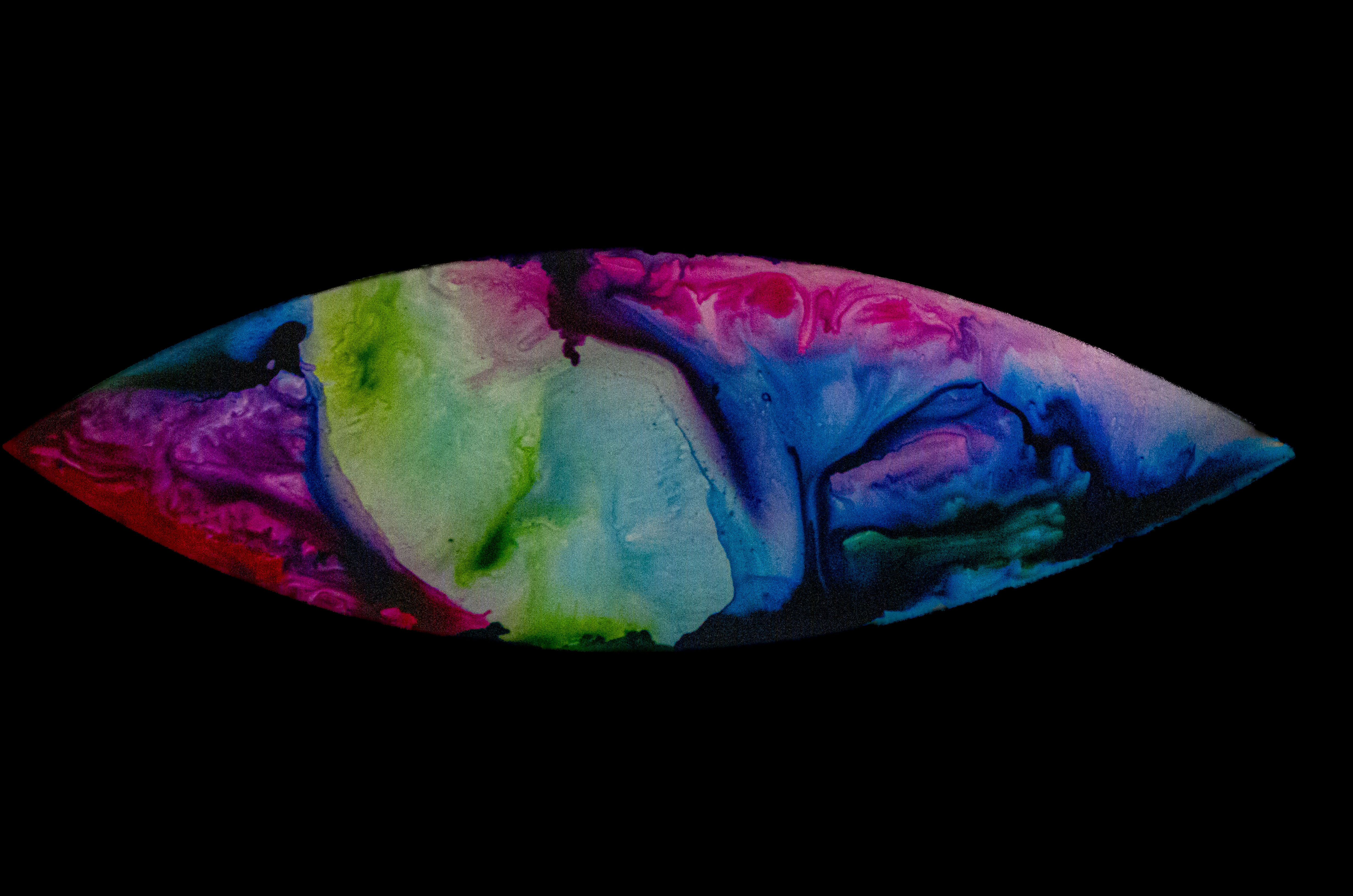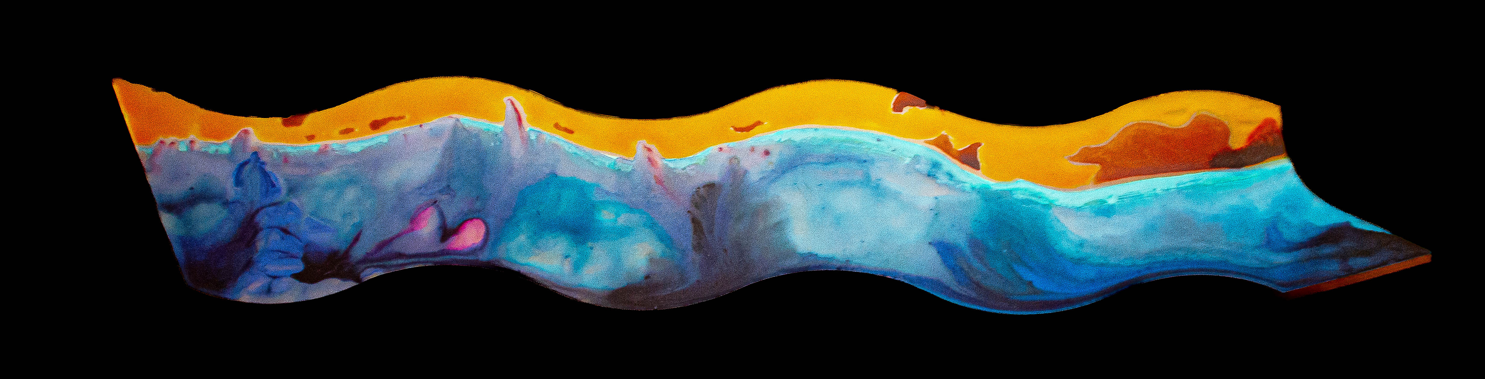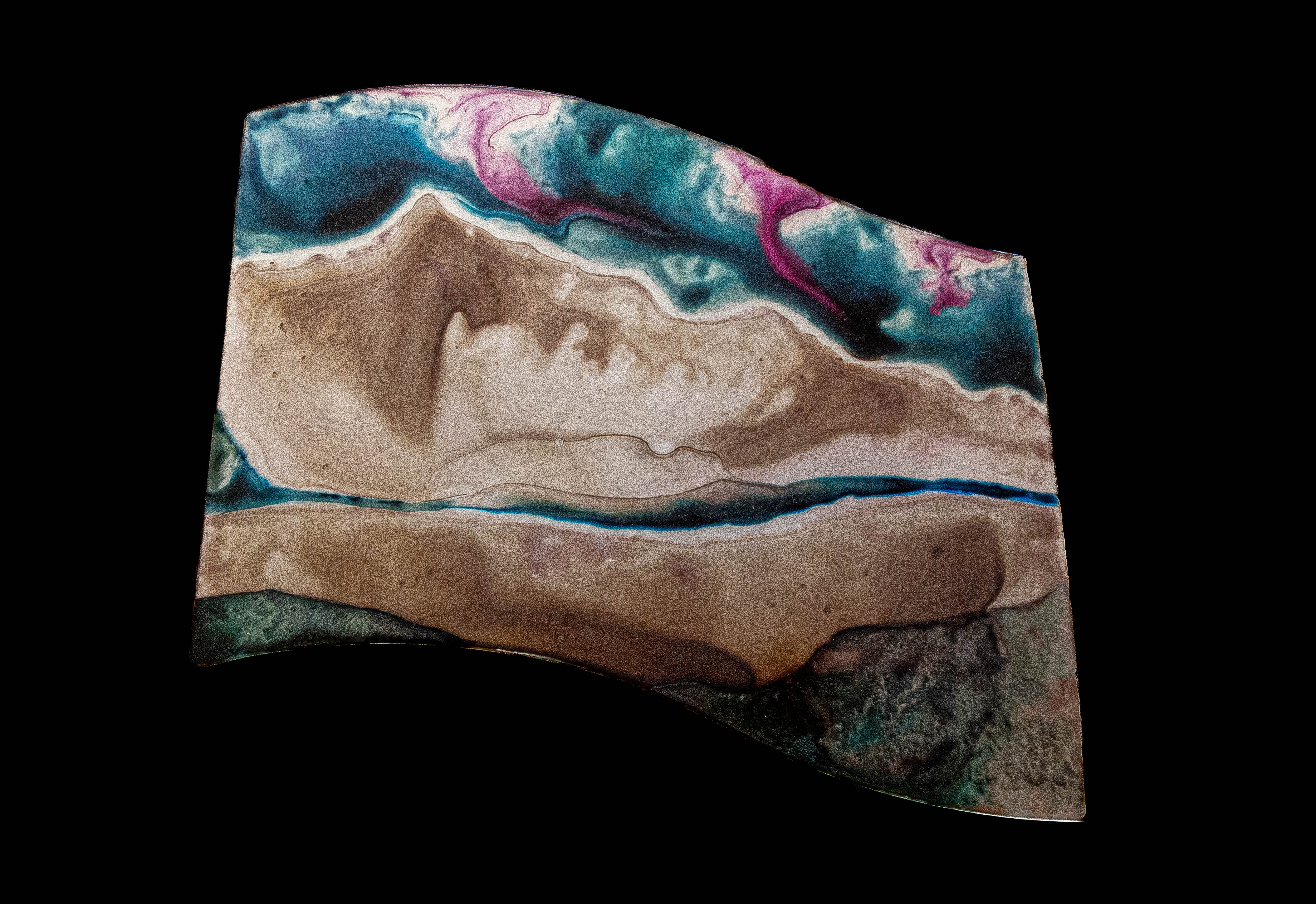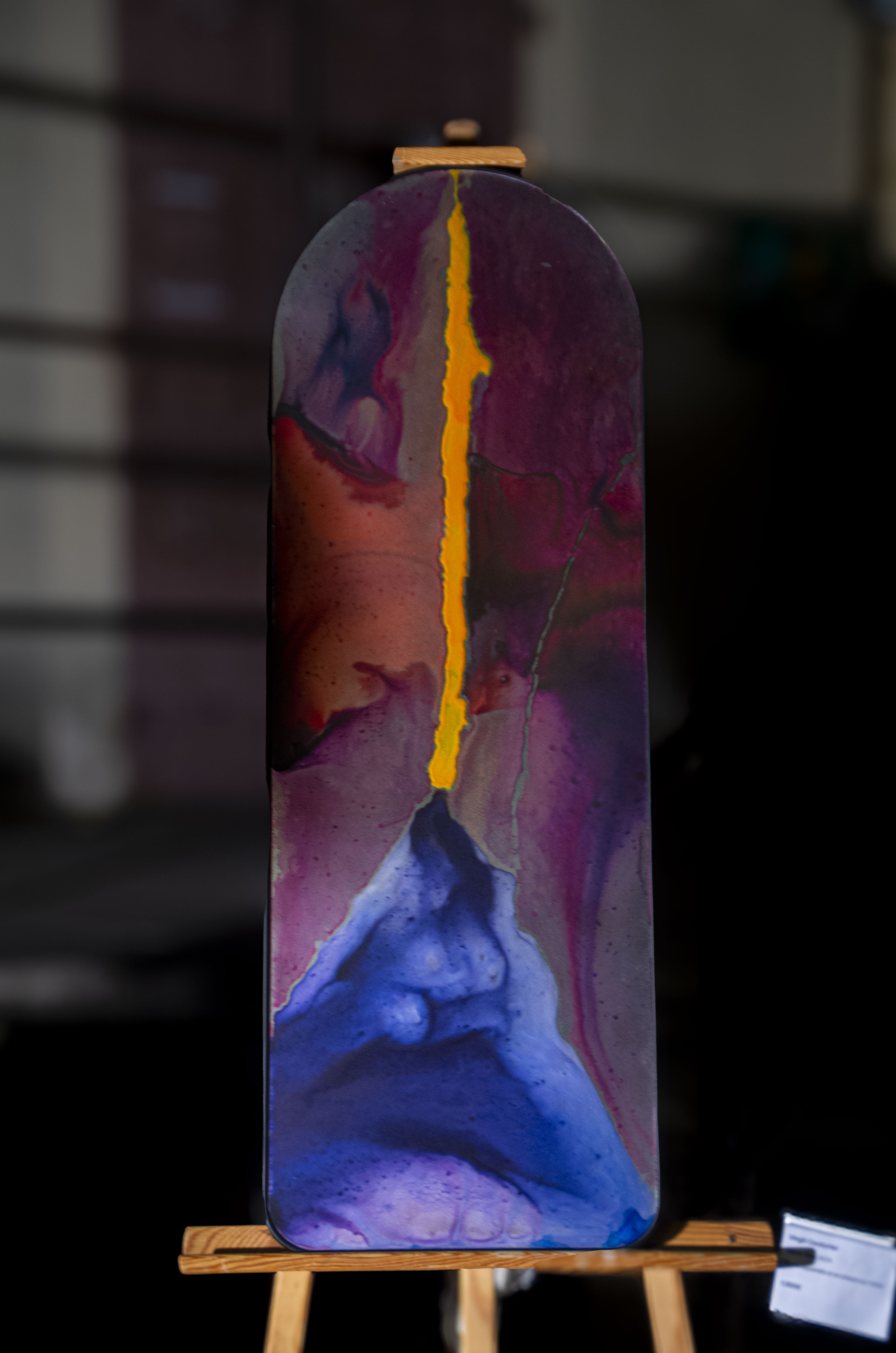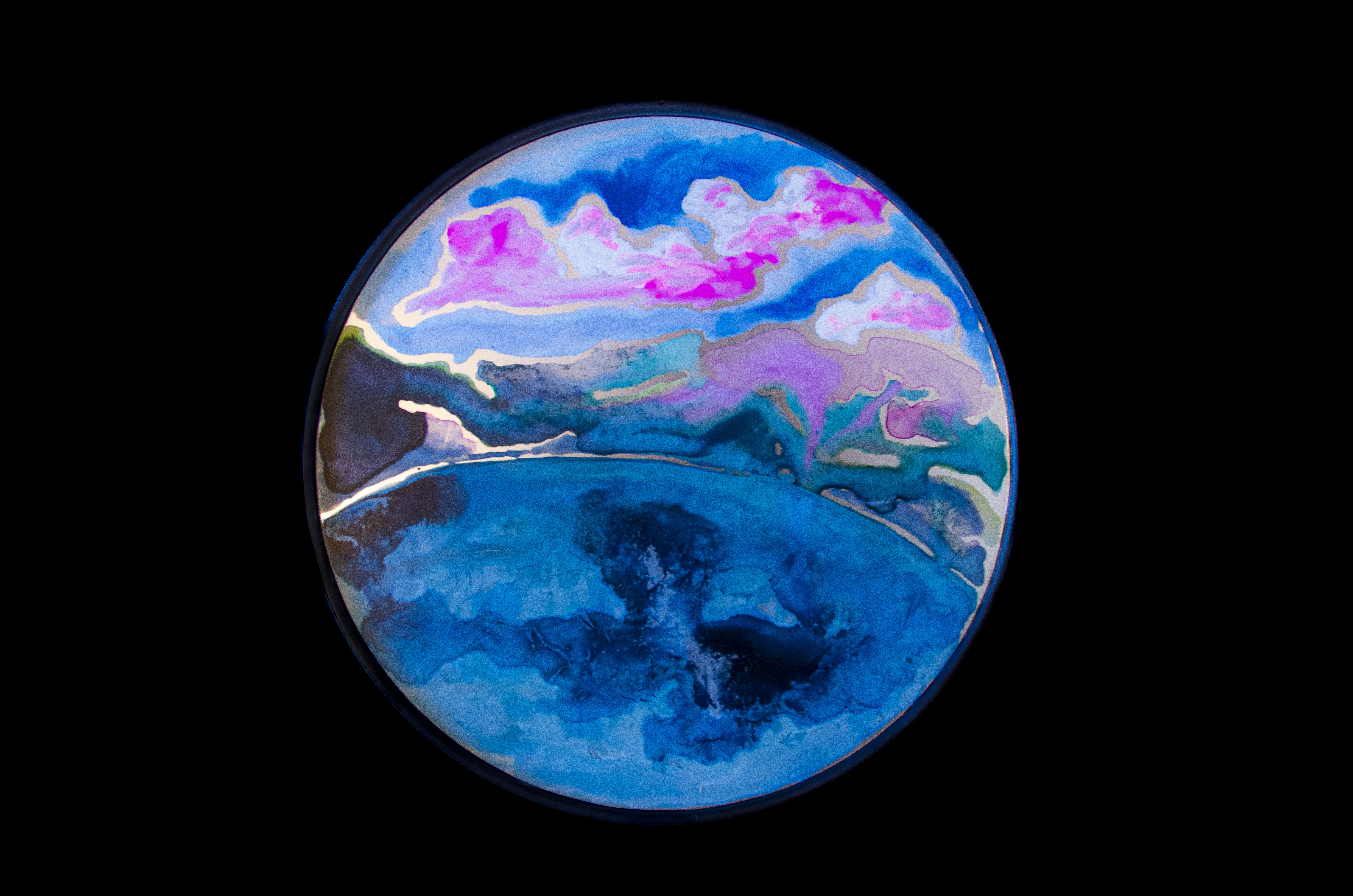 La suite de cette recherche nous emmène jusqu’à la peinture. Il propose aujourd’hui une série d’œuvres réalisées sur miroir, en utilisant de l’encre acrylique et de l’aquarelle. Son travail explore les interactions complexes entre la lumière, la transparence des encres colorées et les reflets du support. À travers cette technique, il cherche à atteindre l’inframince entre l’abstrait et le figuratif, créant des compositions énigmatiques qui évoluent en fonction du regard du spectateur.