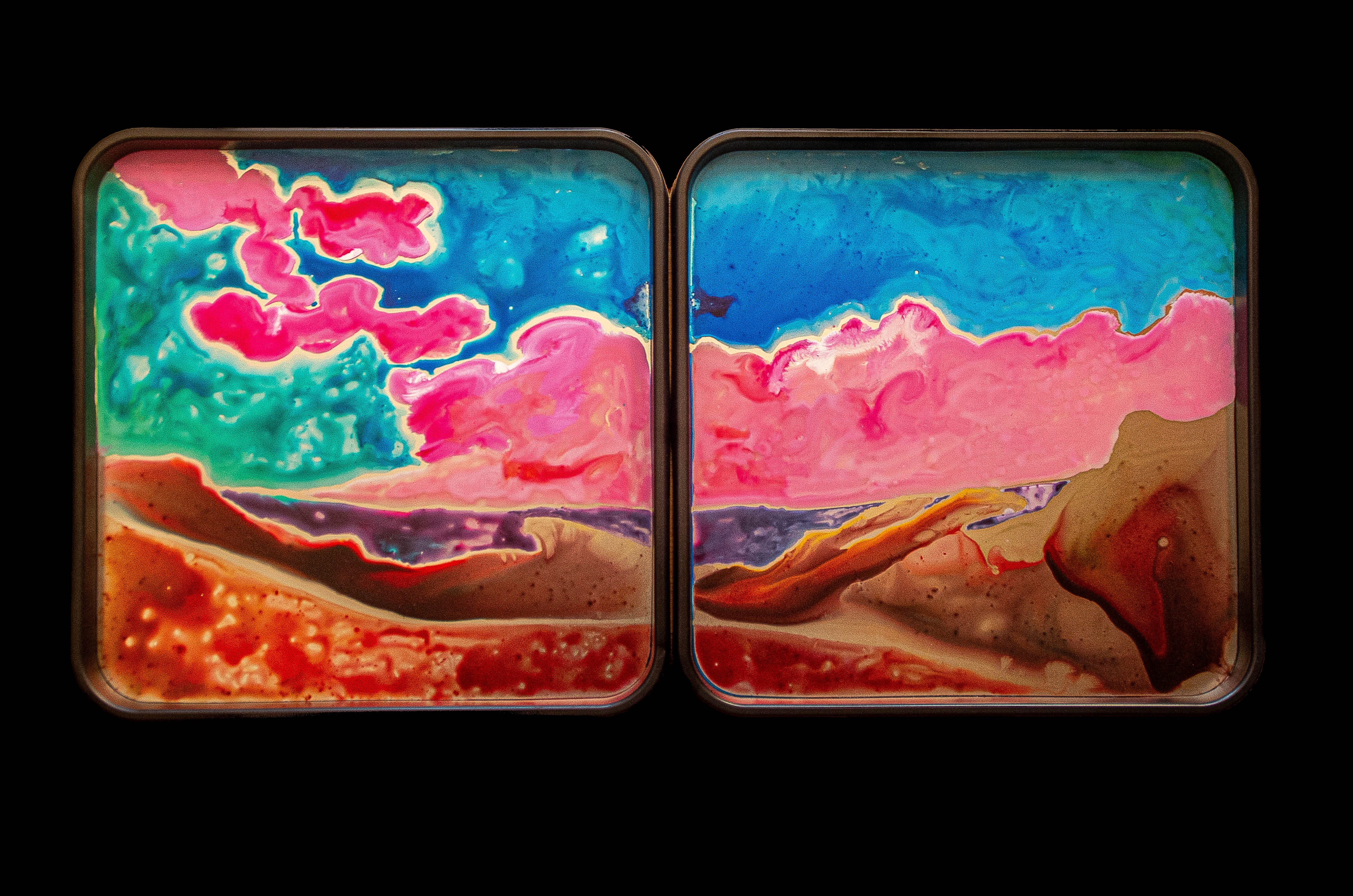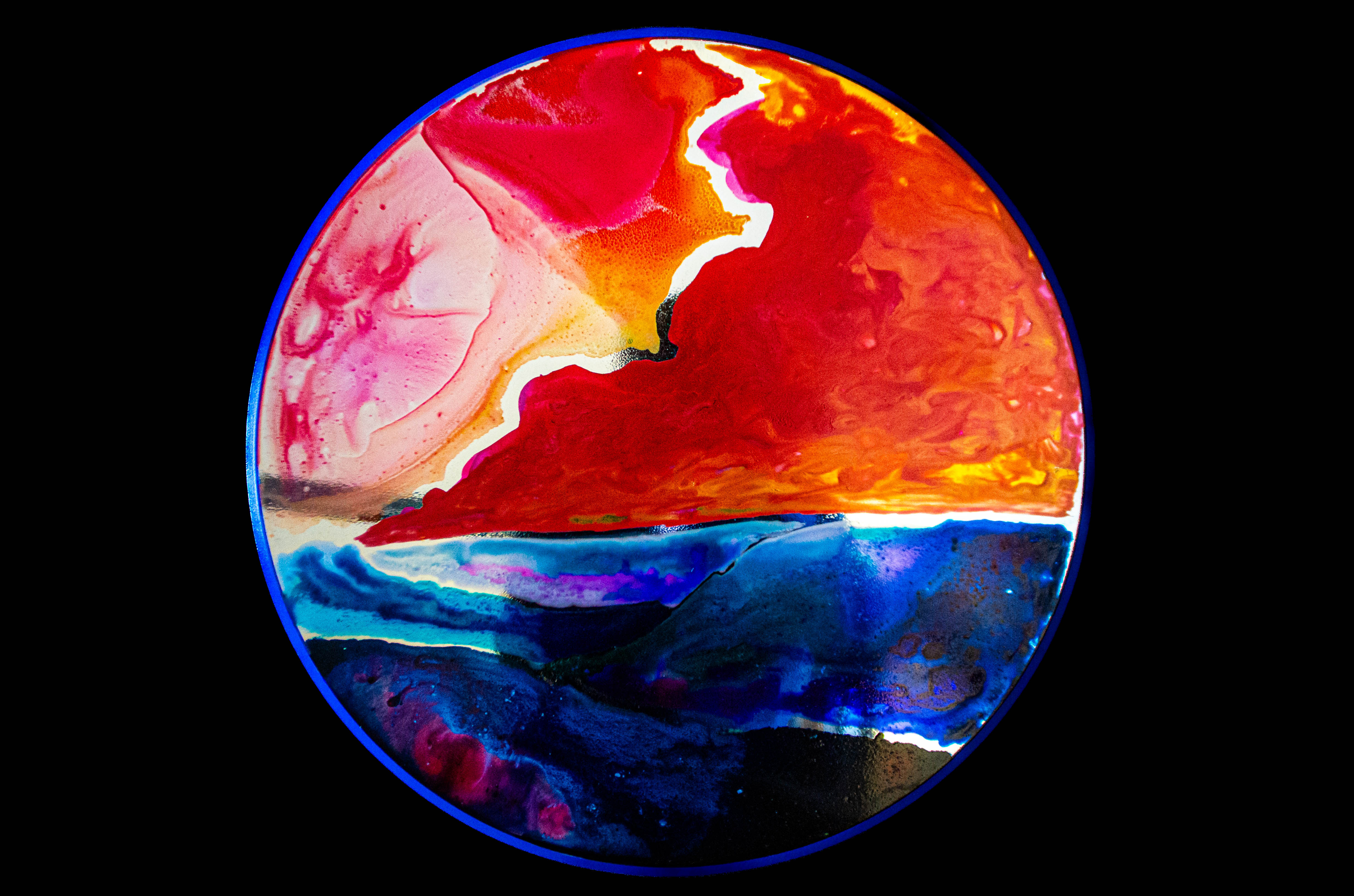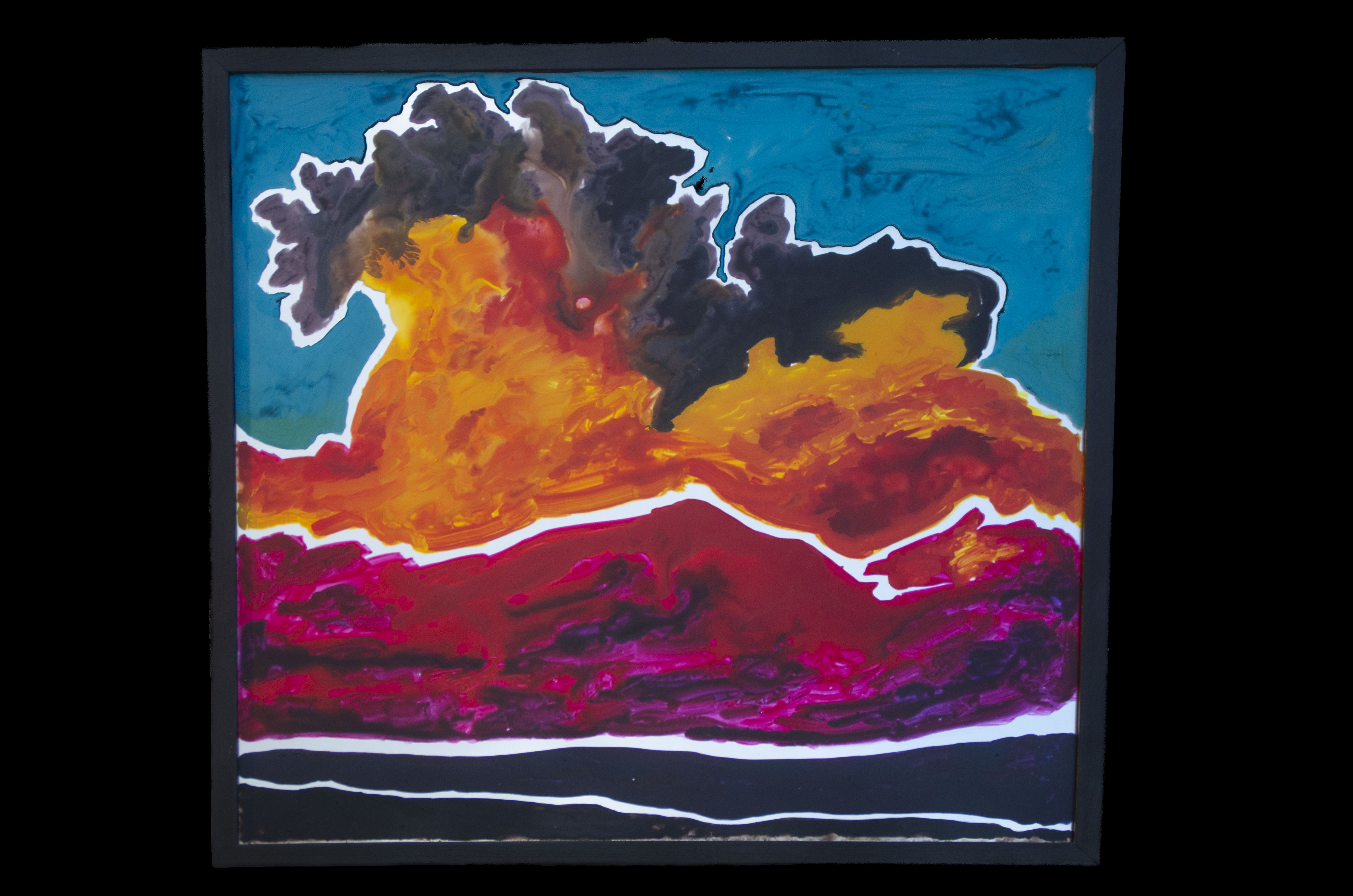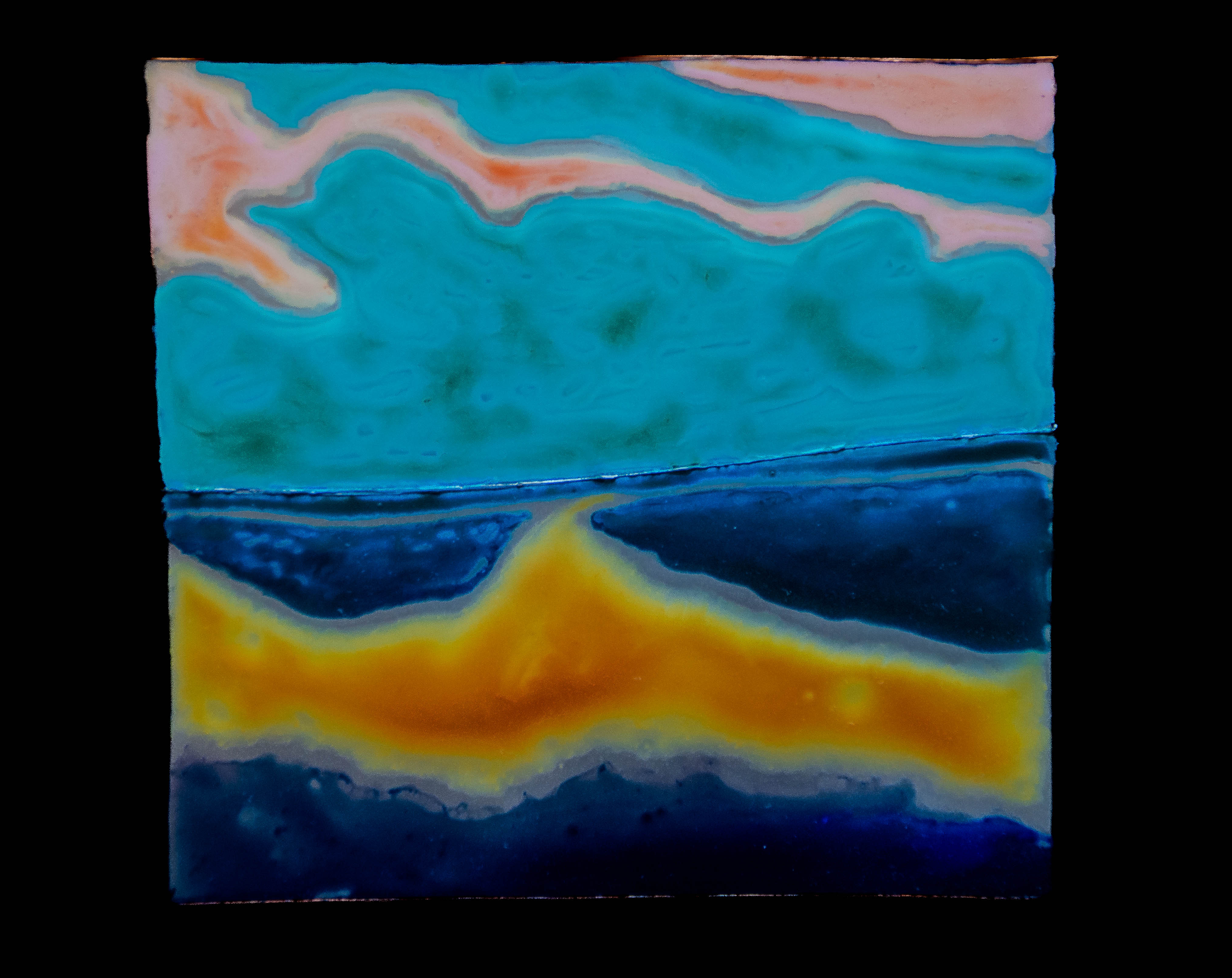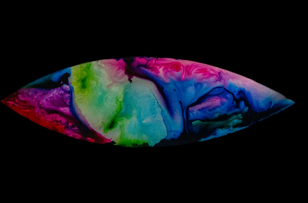 La suite de cette recherche nous emmène jusqu’à la peinture. Il propose aujourd’hui une série d’œuvres réalisées sur miroir, en utilisant de l’encre acrylique et de l’aquarelle. Son travail explore les interactions complexes entre la lumière, la transparence des encres colorées et les reflets du support. À travers cette technique, il cherche à atteindre l’inframince entre l’abstrait et le figuratif, créant des compositions énigmatiques qui évoluent en fonction du regard du spectateur.